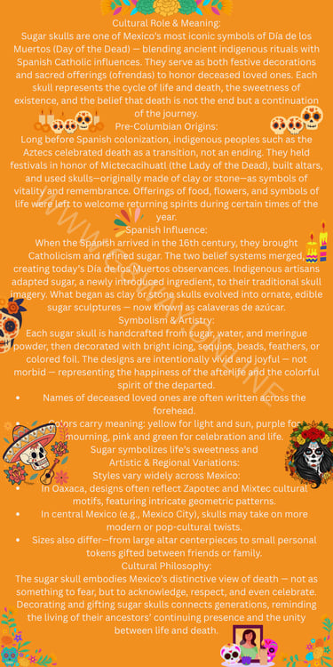 Let’s set the record straight — Día de los Muertos has been exclusively "Mexican" since the 1820's. And yes, its current imagery — including La Catrina — was shaped in Mexico, but its spiritual foundation comes from a much broader and older human truth. Nearly every culture across Latin America — and the world — has a way to honor the ancestors. The Mexican expression just happens to be one of the most beautiful and recognizable. So if you’re honoring your own — whether you’re Puerto Rican, Dominican, or anything else — you’re not “appropriating.” You’re participating in the shared act of remembering where you come from. End of story.